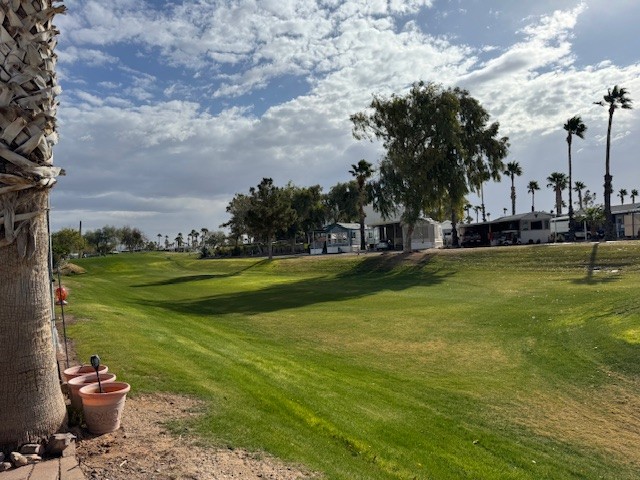 Lot lease included until October 2026. 2nd owner home has been well kept. Irrigation for all plants. New extra sturdy awning. New interior & exterior paint. A/c is well maintained. Nestled on a peaceful street backing the 2nd fairway, this beautifully updated home offers serene golf course views and enhanced privacy. Inside, enjoy a remodeled bathroom with an oversized shower, new blinds, and a brand-new refrigerator. Energy-efficient solar shades grace the exterior windows. The detached casita with a Murphy bed is perfect for guests or a private retreat, and a stackable washer/dryer adds convenience. This gem blends comfort, style, and location—don’t miss your chance to call it home!