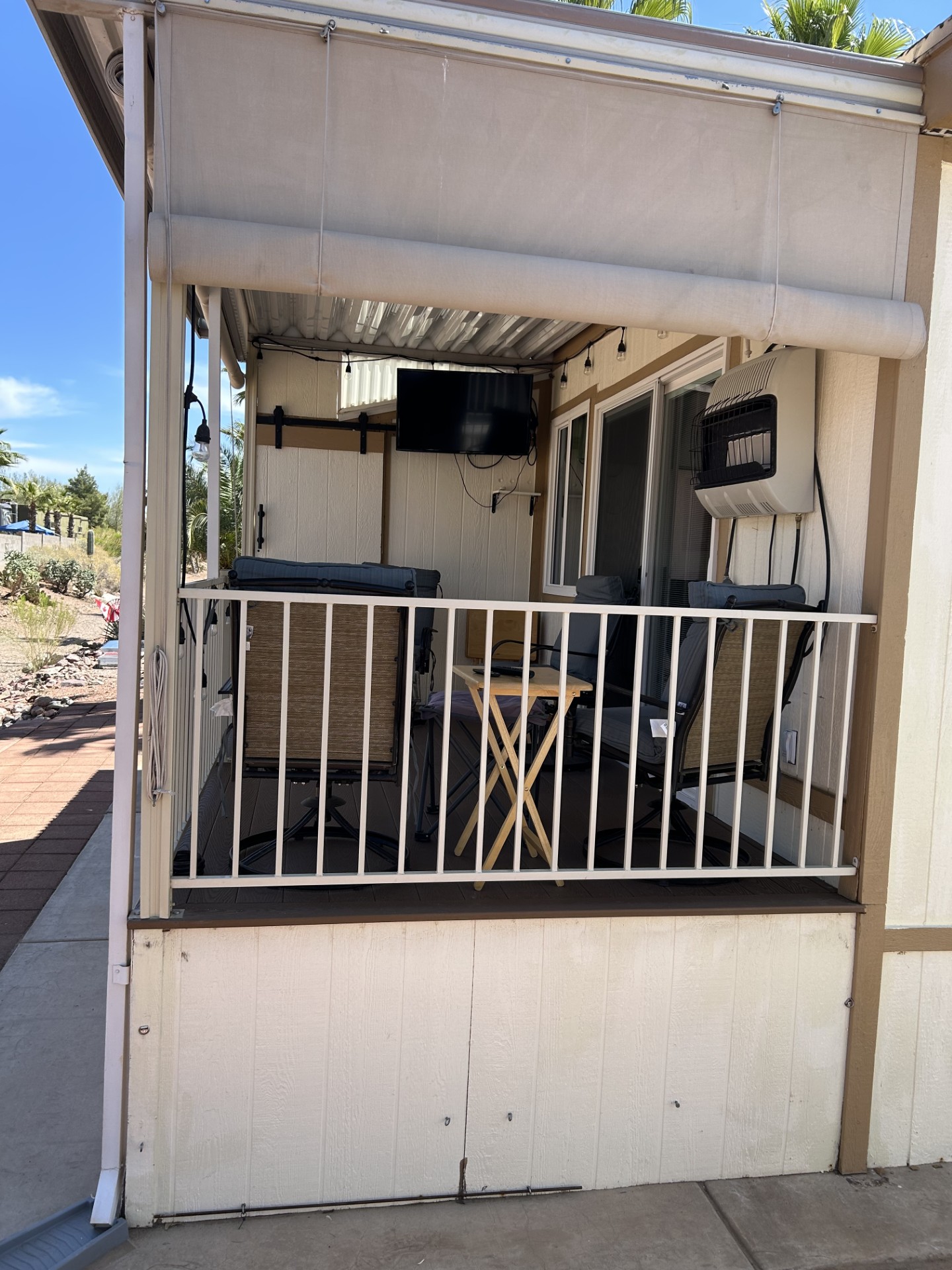 2008 Cavco AZ Room added in 2014. Nicely appointed unit. Cupboards and woodwork repainted in 2023. This includes main bathroom and bedroom. New appliances, microwave 2025, refrigerator 2015, dishwasher 2022. Flooring upgrade to laminate and vinyl in 2nd bathroom. Two full bathrooms. Stackable washer & dryer. All new windows and roof in 2015. Four smart tvs. Living room 70 inch. Living room has infrared fireplace. Sliding door to deck that has blinds within the glass. New double stainless steek sink installed along with new faucets and reverse osmosis water system. Feeds icemaker in refrigerator. Regular water softener installed. Separate hot water tank installed for 2nd bathroom and washer & dryer. Drapes in kitchen with honeycomb pull down blinds also installed. All windows have honeycomb pull down blinds. Deluxe lot on wash. Back yard privacy. Beautiful light display along wash at night. Deck can be enclosed with pull down blinds to offer space for blow up bed if required.