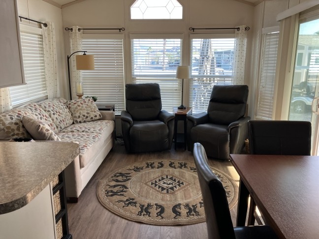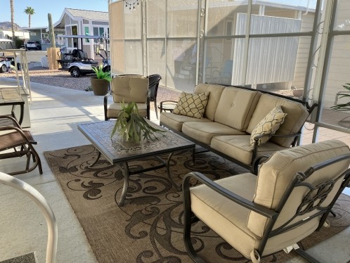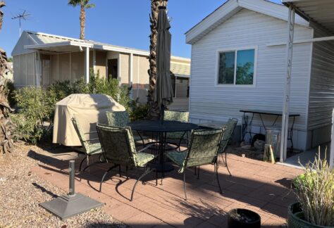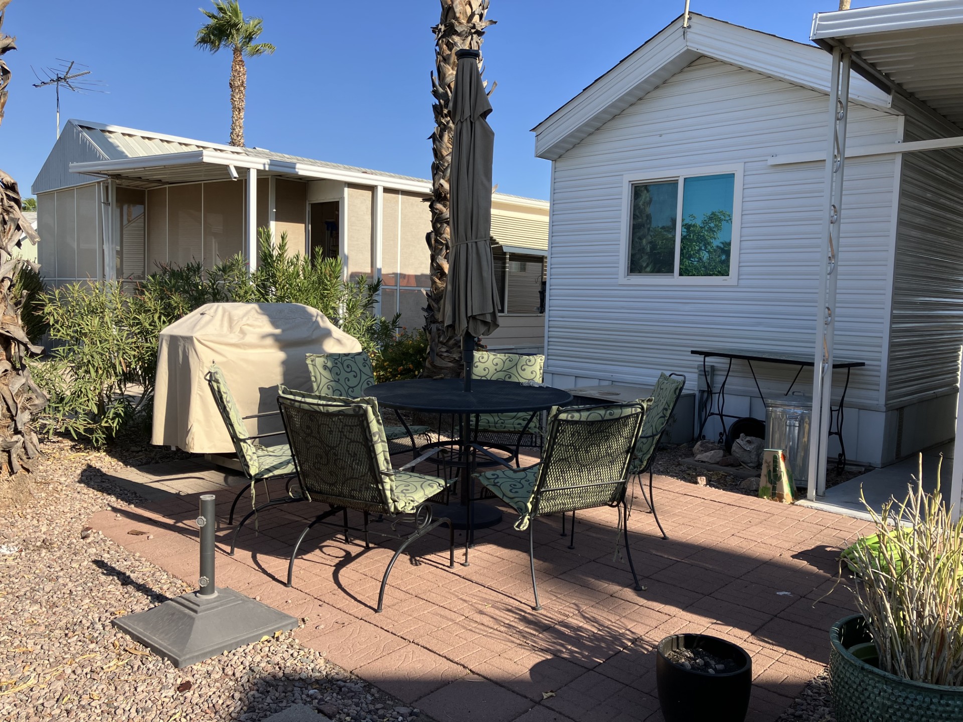 Affordable home on an exceptionally long lot with front, back and undercover patios ready for entertaining. A great view of the Superstition Mountains makes for an ideal location. Dual pane windows, new roof, upgraded interior featuring painted cabinets, granite sink, newer appliances and plumbing fixtures, plus wooden blinds and expandable table all add to the desirable features. The shed has ample storage and washer & dryer. The unit is available immediately and lot rent paid until October 1, 2026.