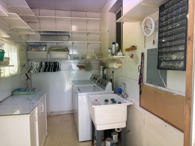 Concrete patio in back. Shed has washer & dryer, deep sink, finished and insulated. Also heated and cooled.
