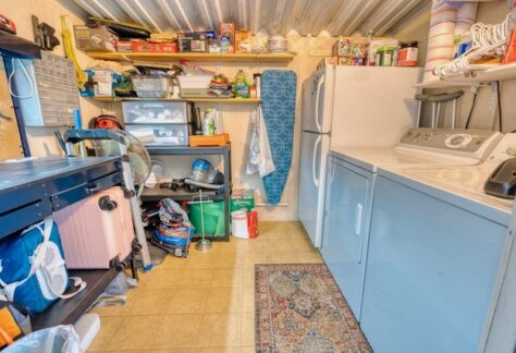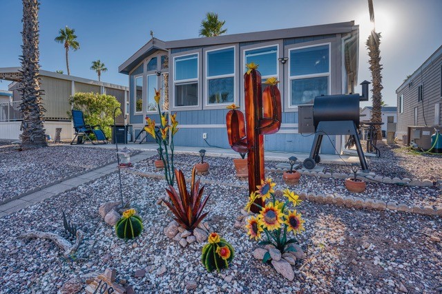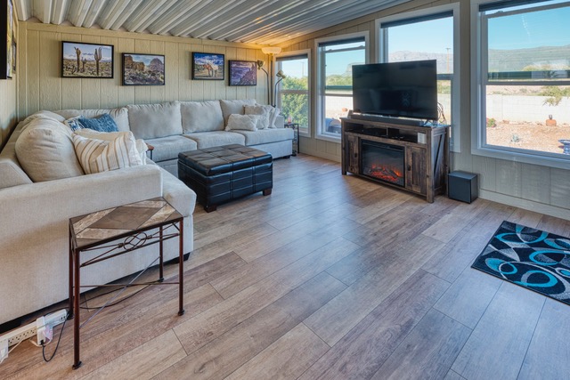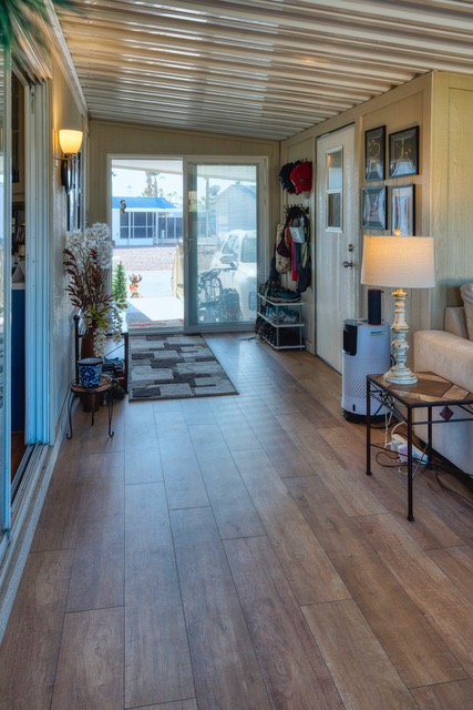 2022 in AZ Room – dual pane windows, replaced rear door, flooring, tv & tv stand with fireplace. Sofa&ottoman, end tables, lamp & entryway bench. Outside metal landscaping.