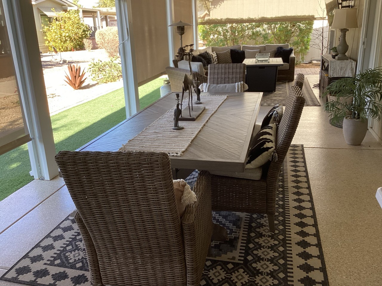 The spacious, contemporary kitchen flows seamlessly into the living and dining areas, offering an airy, welcoming atmosphere ideal for gatherings of any size. Just beyond the main living space, step out onto the covered back patio, where you can enjoy your morning coffee or unwind at sunset. With commercial high-pressure misting systems on both front and rear porches and retractable sunshades, this outdoor space is comfortable year-round.