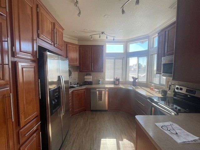 🍽️ The kitchen features generous counter space, ample cabinets, and stainless steel appliances, all brightened by abundant natural light.